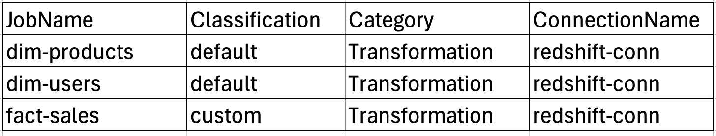 jobs.csv - Defines the Glue jobs and their classifications. This file acts as the source of truth for the jobs you want to deploy. The columns can be adjusted as needed. Take note of the classification as well, this will be used for identifying whether to provision the job as default or custom, which will be discussed below.