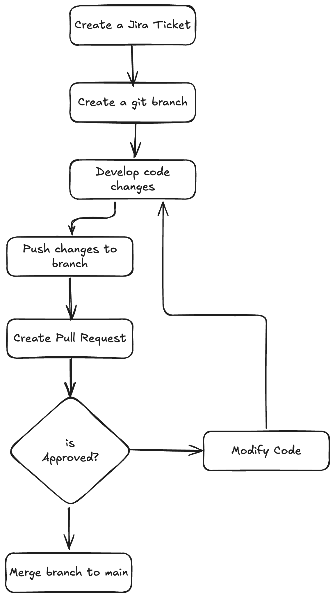 To ensure consistency and collaboration across the team, we follow a structured development workflow, as outlined in the diagram above. This workflow integrates tools like Jira for task tracking, integrated to GitHub to map the tickets to the git branches. The workflow is pretty standard.